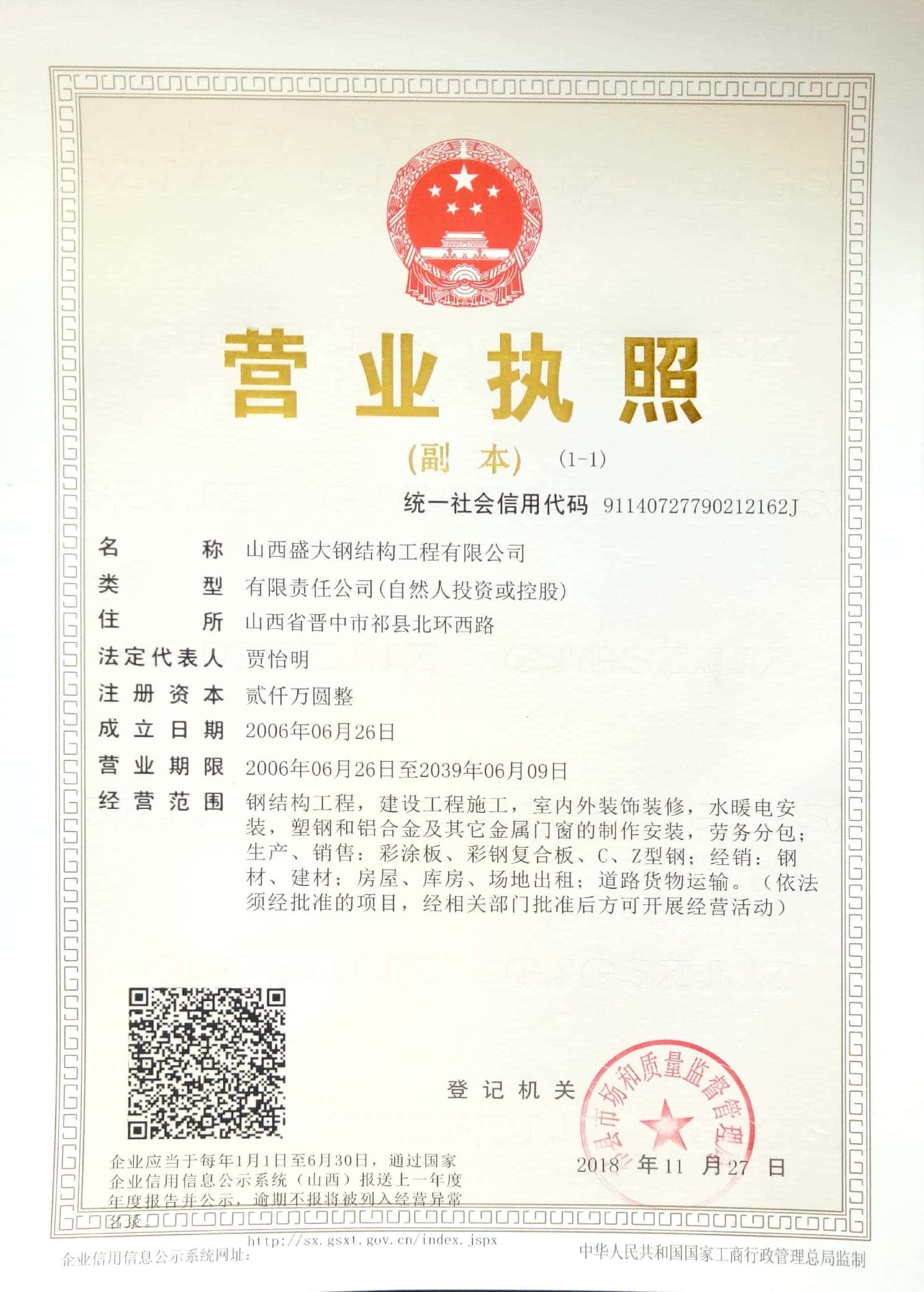 山西盛大鋼結(jié)構(gòu)工程有限公司 山西盛大鋼結(jié)構(gòu)工程有限公司成立于1996年,坐落于國家歷史文化名城——山西祁縣。擁有兩大智能化鋼結(jié)構(gòu)生產(chǎn)基地,占地110畝,建筑面積3萬余平方米,具備鋼結(jié)構(gòu)專業(yè)承包貳級、建筑工程施工總承包貳級資質(zhì),是一家集設計、制造、施工于一體的大型鋼結(jié)構(gòu)工程企業(yè)。 盛大鋼構(gòu)是中國鋼結(jié)構(gòu)協(xié)會會員單位,山西鋼結(jié)構(gòu)協(xié)會副會長單位,山西建筑企業(yè)商會理事單位,山西省土木建筑學會會員單位,擁有國家知識產(chǎn)權(quán)局注冊商標。公司已通過ISO9001質(zhì)量管理體系認證,體系覆蓋鋼結(jié)構(gòu)加工與施工等核心… more +